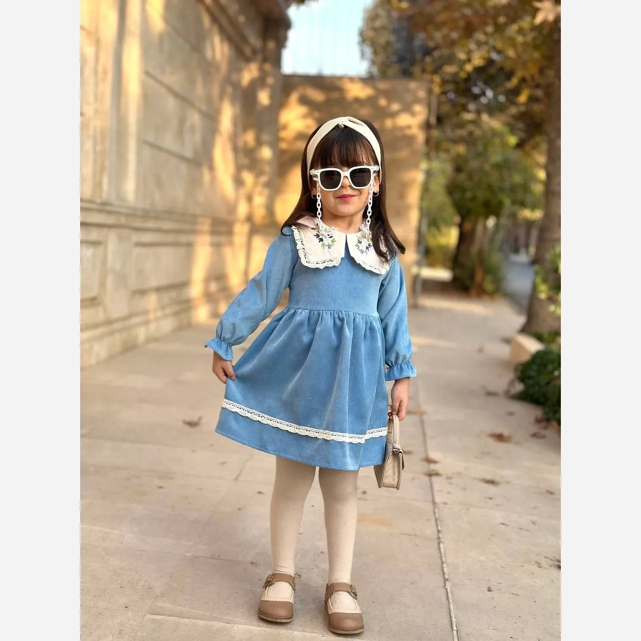 ناموجودپیراهن دخترانه مجلسی مخمل کبریتی موهر یقه گیپور آستین پفی بند تنظیم سایزبندی بچگانه