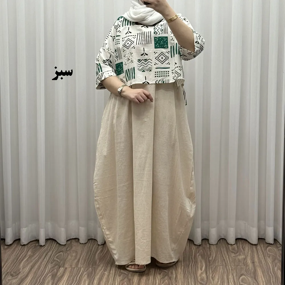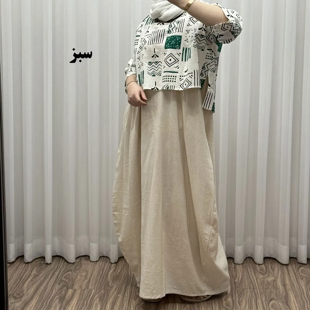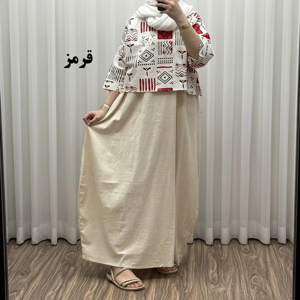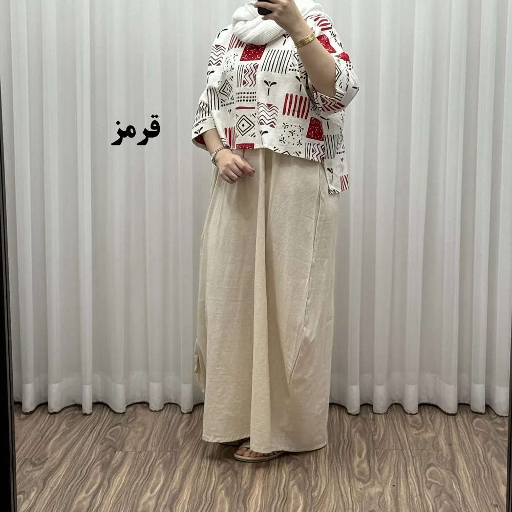 ست کراپ و سارافون لینن زنانه فری سایز مناسب تا 48