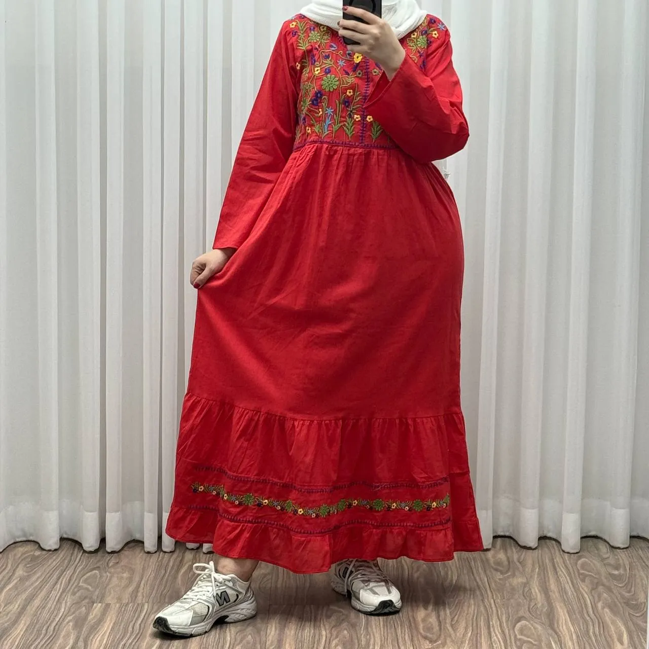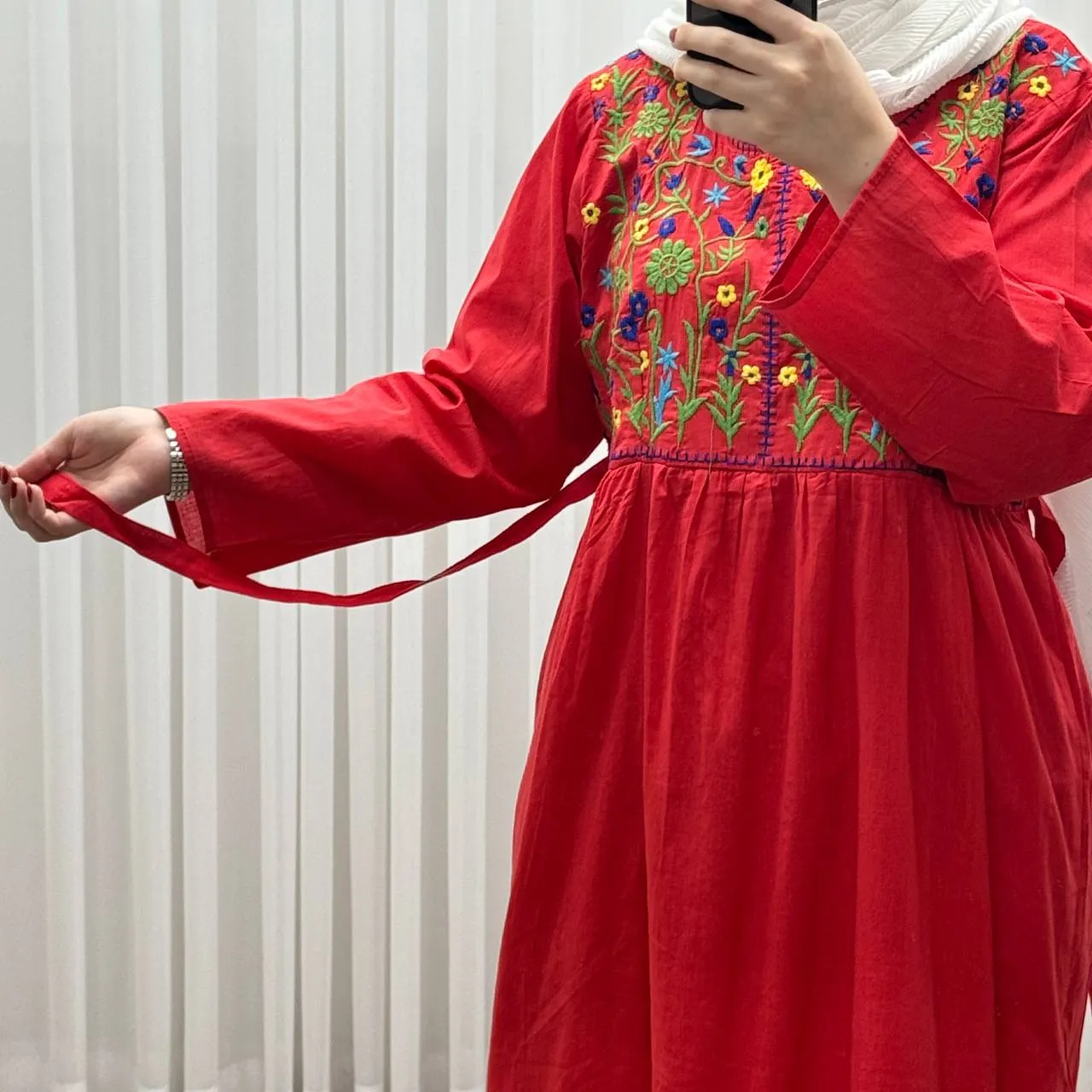پیراهن نخی زنانه فری سایز تا 46 گلدوزی شده شیک و راحت کمربند دار چهارفصل