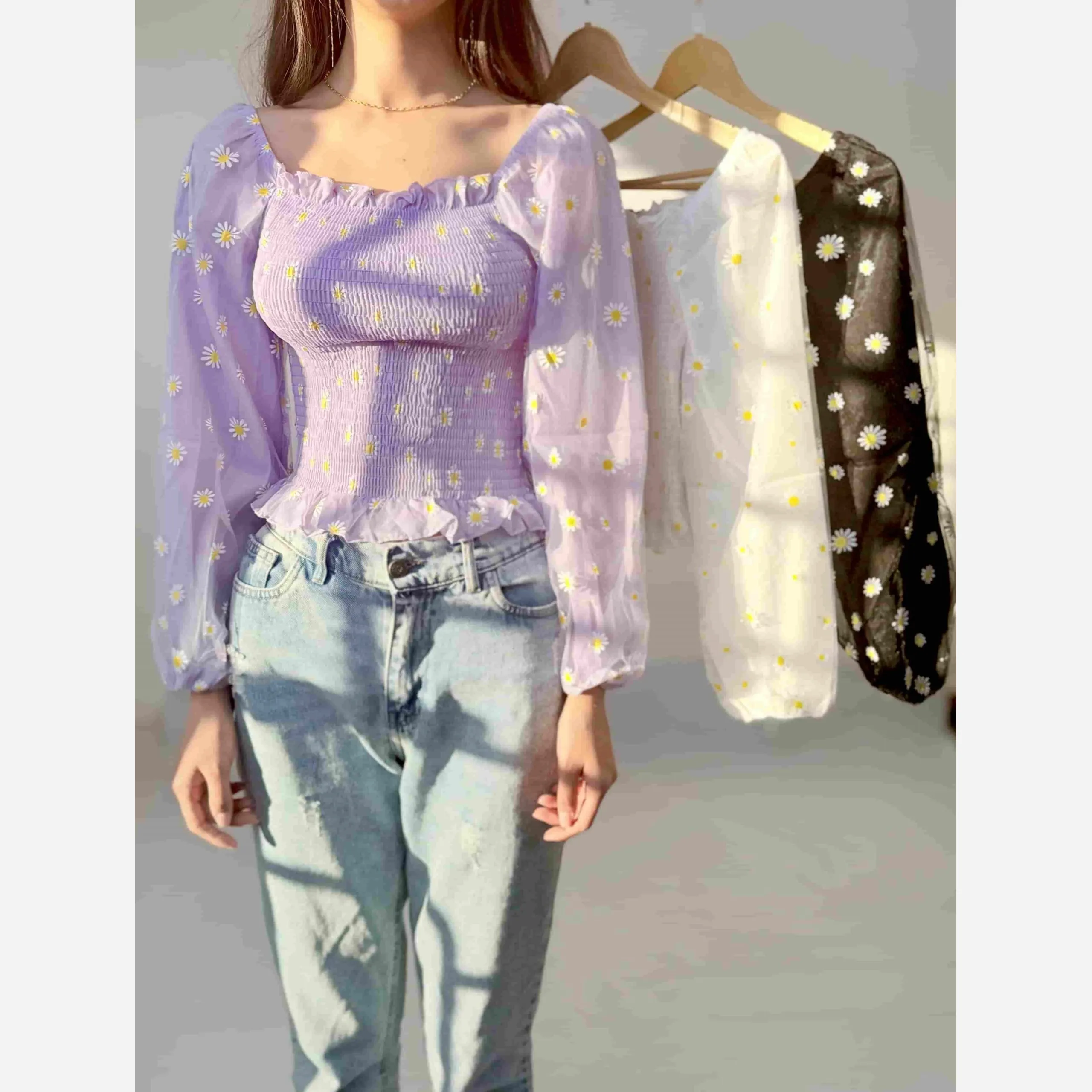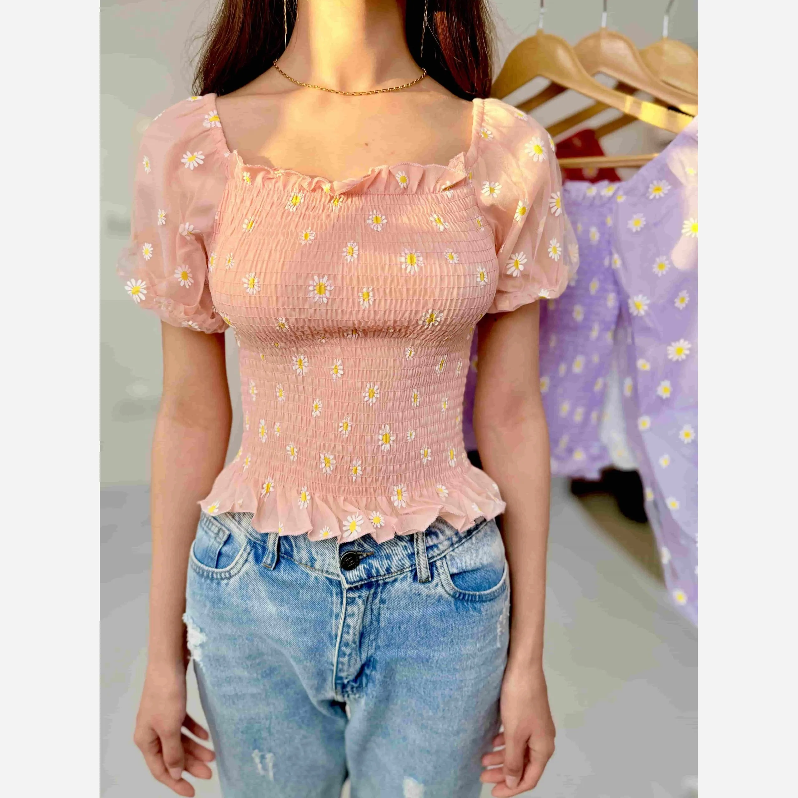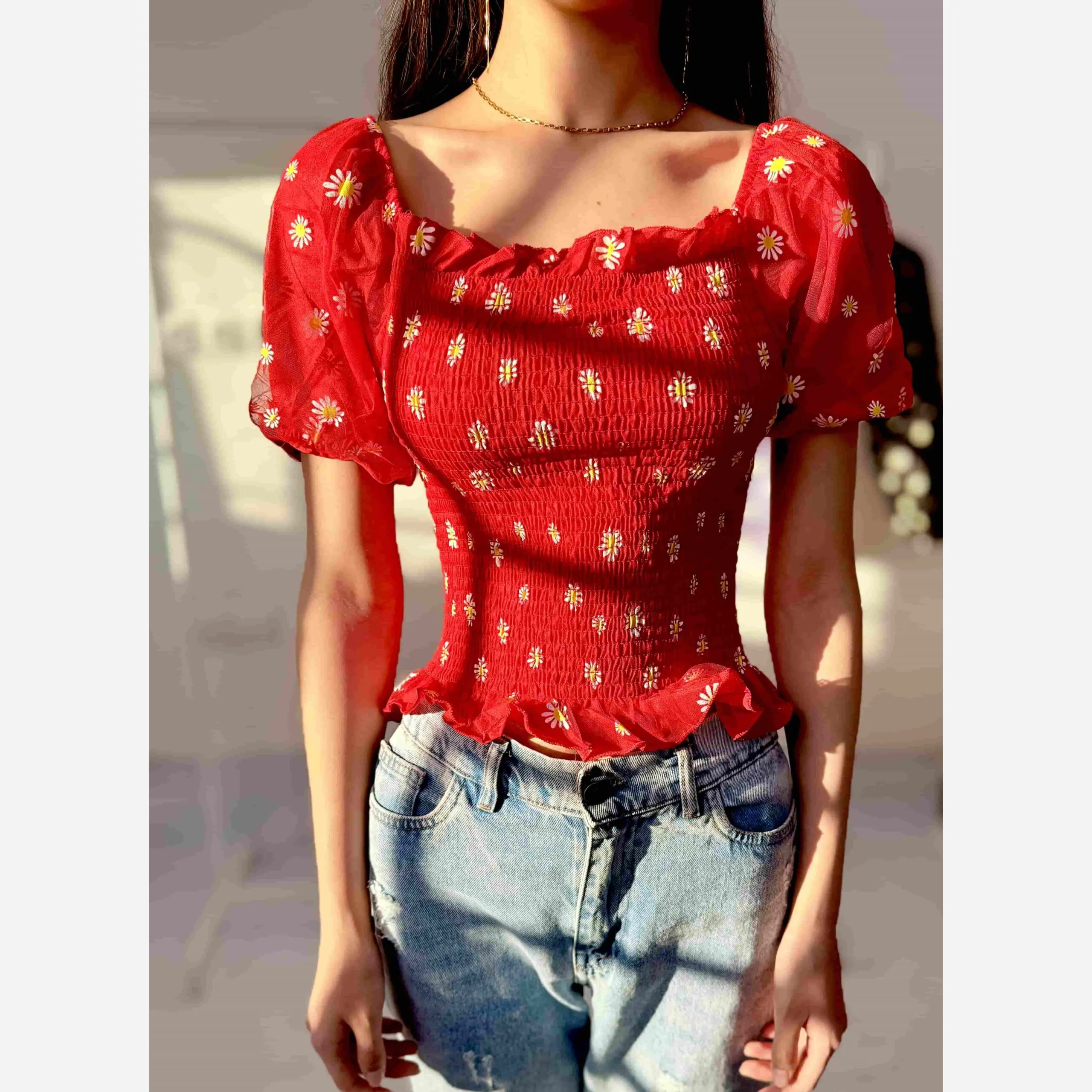 پیراهن کراپ بابونه نخ طوری فری سایز مناسب تا 38 تنخور شیک و راحت چهارفصل بدون سایه اندازی