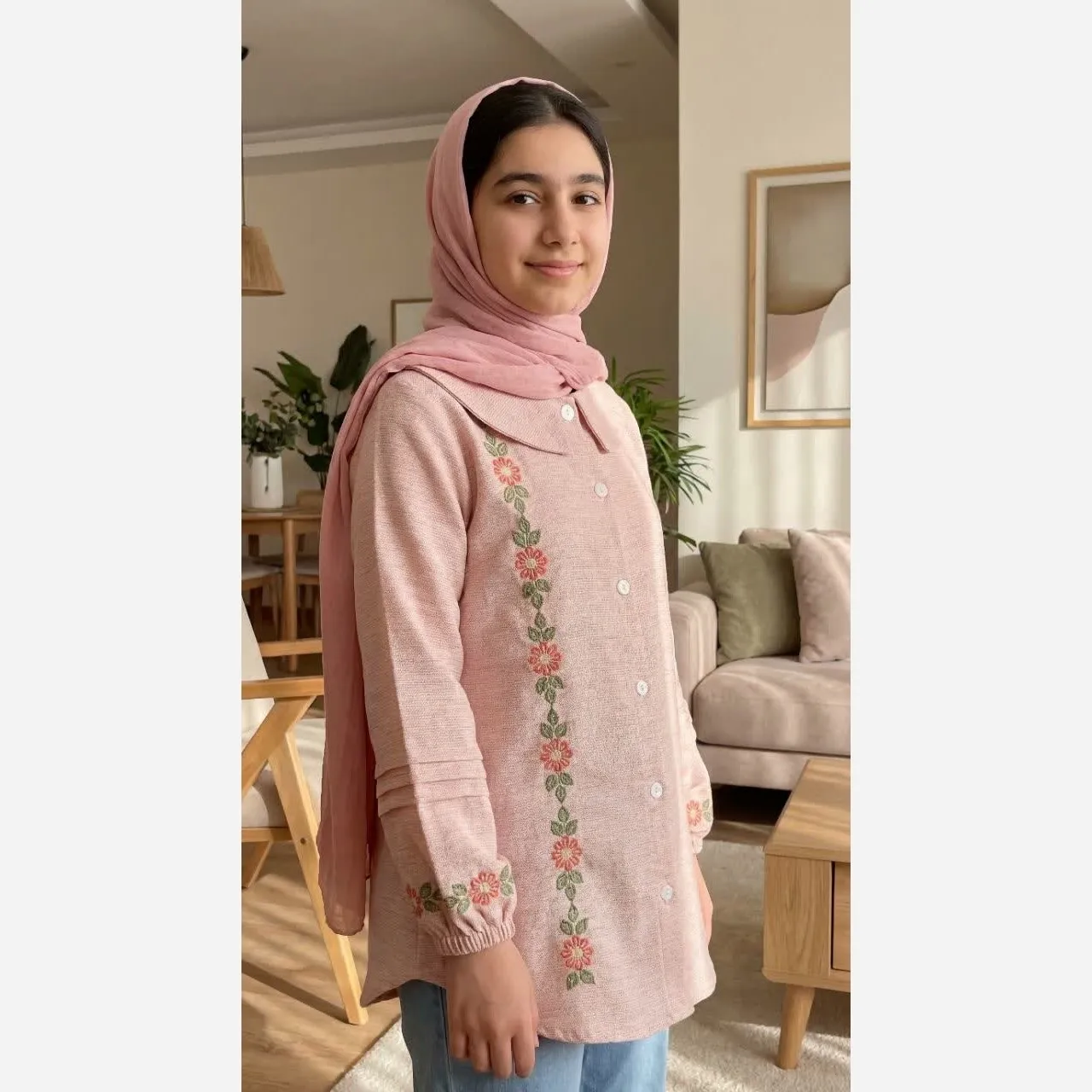 🌿 طراحی: گلدوزی ظریف روی جلو و مچی آستین 🌺