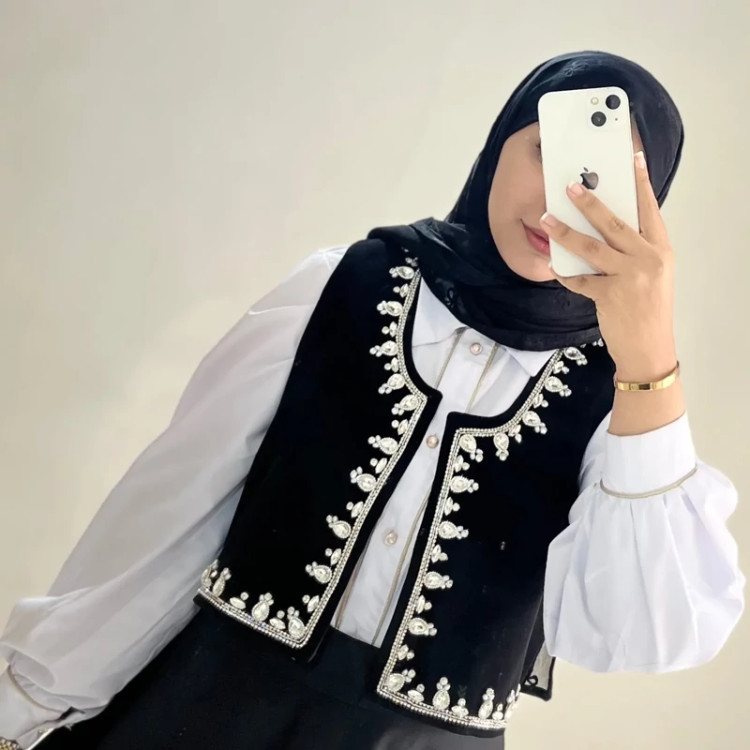 جنس پارچه از كرپ كنزو كج راه درجه يك (فوق العاده مشکی ) جواهرات بادست دوخته شده