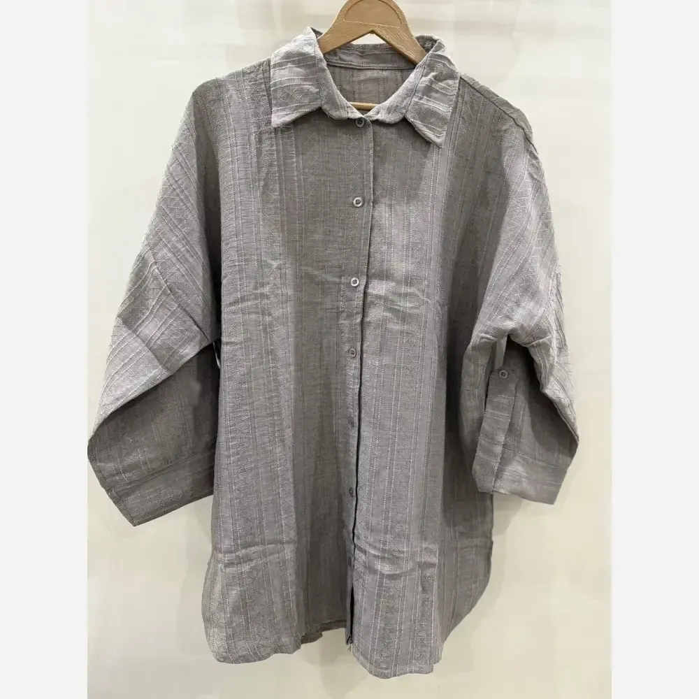 جزئیات جذاب این شومیز شامل یقه مردانه کلاسیک و آستینهای پاگوندار است که قابلیت تنظیم قد آستین را با بندینک فراهم میکند. دکمههای کامل جلو، امکان استفاده از آن را به عنوان مانتو یا یک رویه شیک روی تیشرت فراهم میسازد. 👌