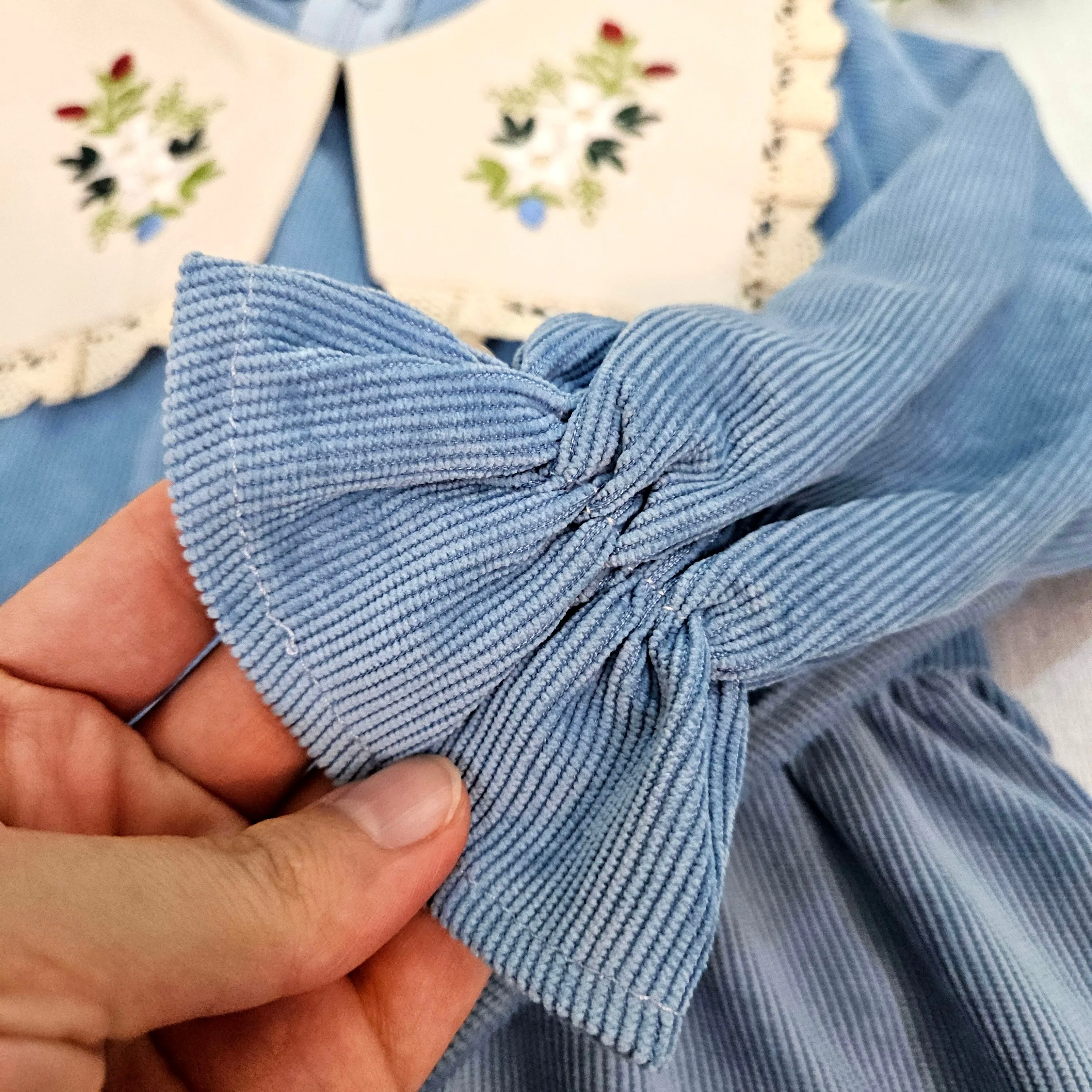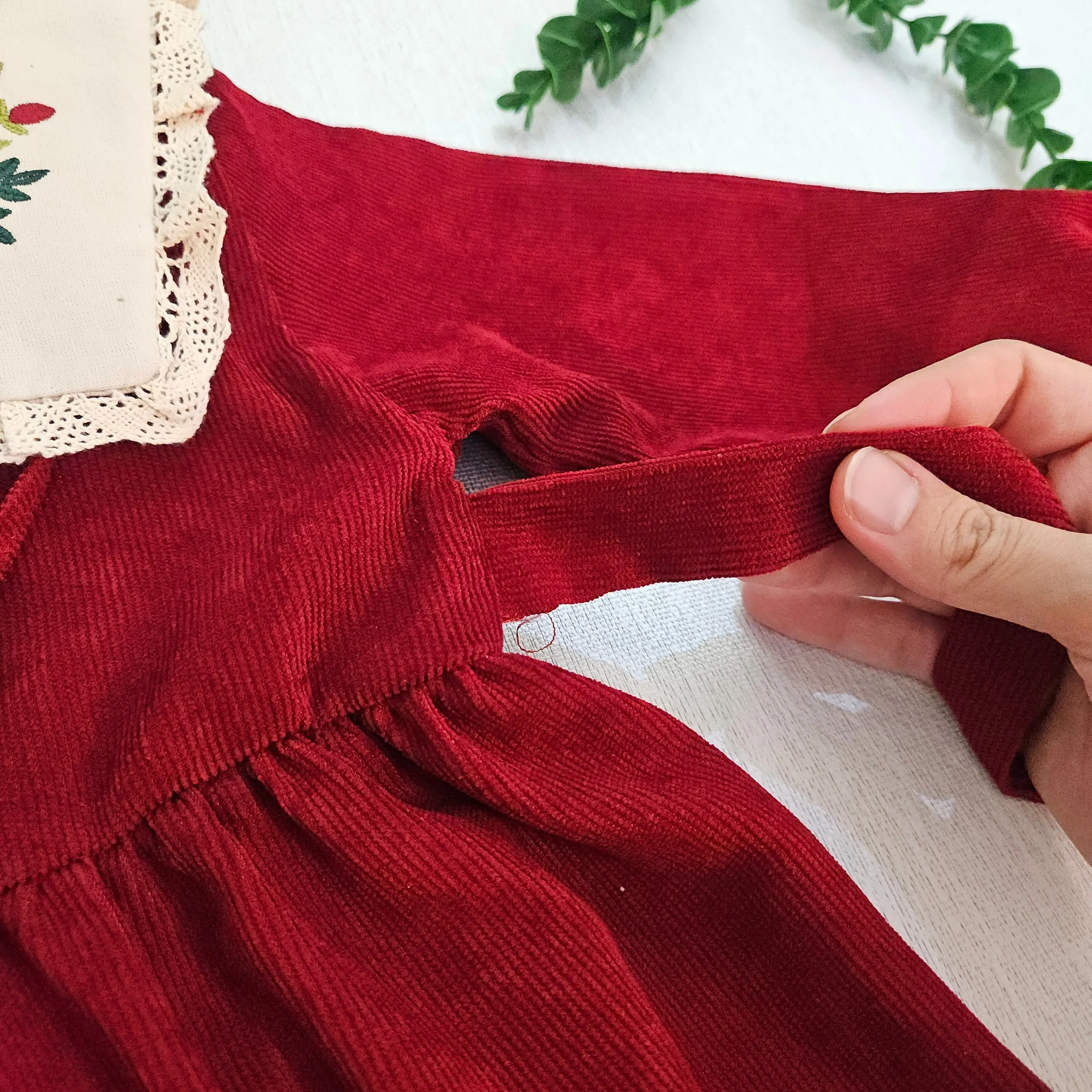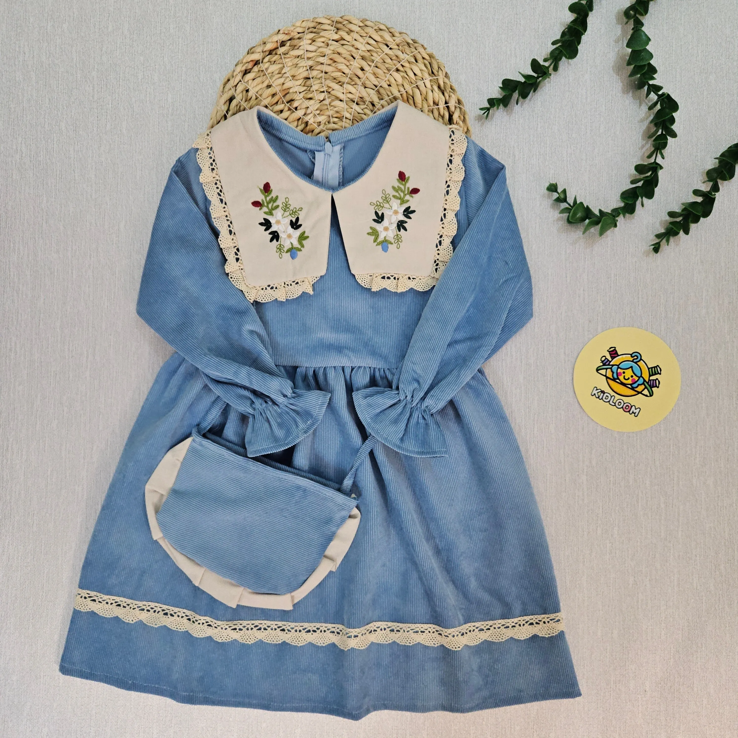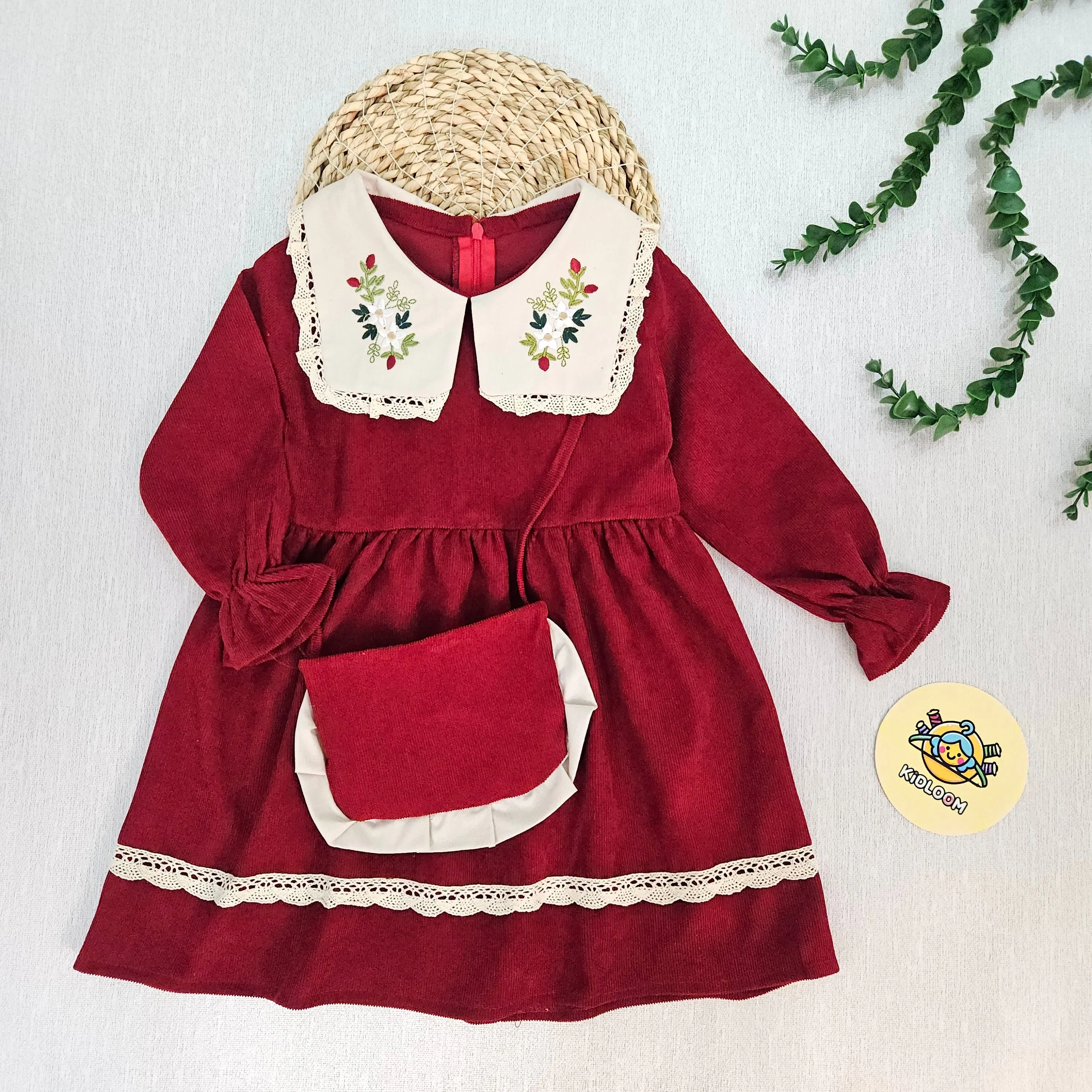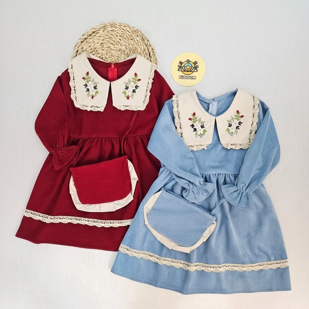 پیراهن دخترانه مجلسی مخمل کبریتی یقه گلدوزی شده آستین پرنسسی همراه کیف هدیه 2 تا 9 سال